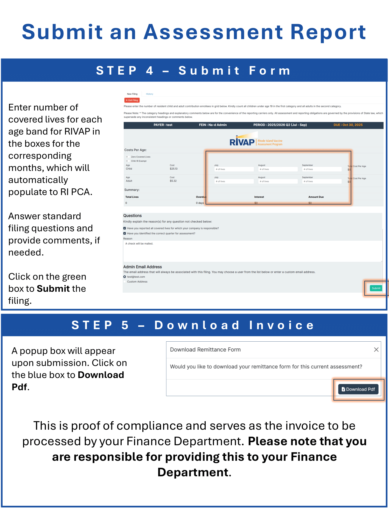 Covered lives are reported through the existing RIVAP quarterly filing process. RI PCA invoices are automatically generated based on reported covered lives and the applicable uniform assessment rate.