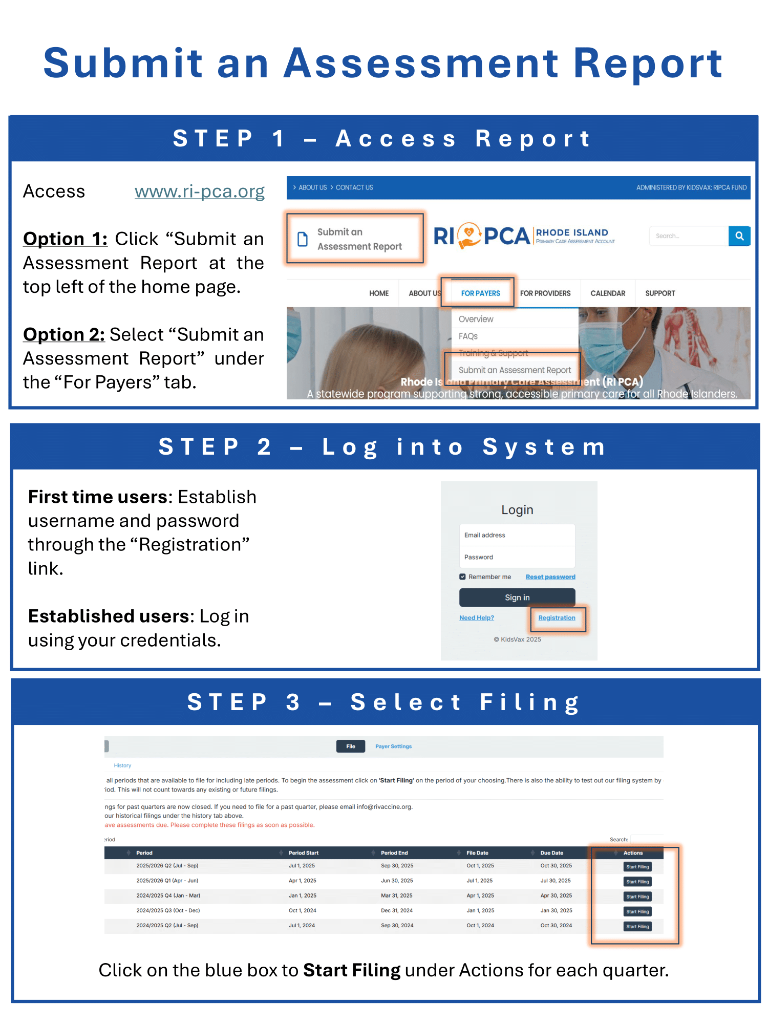 Covered lives are reported through the existing RIVAP quarterly filing process. RI PCA invoices are automatically generated based on reported covered lives and the applicable uniform assessment rate.